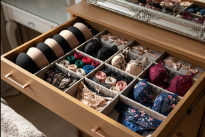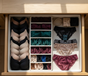 Use drawer dividers. Bras separate from underwear, organized by type (wireless, underwire, etc.) or color.